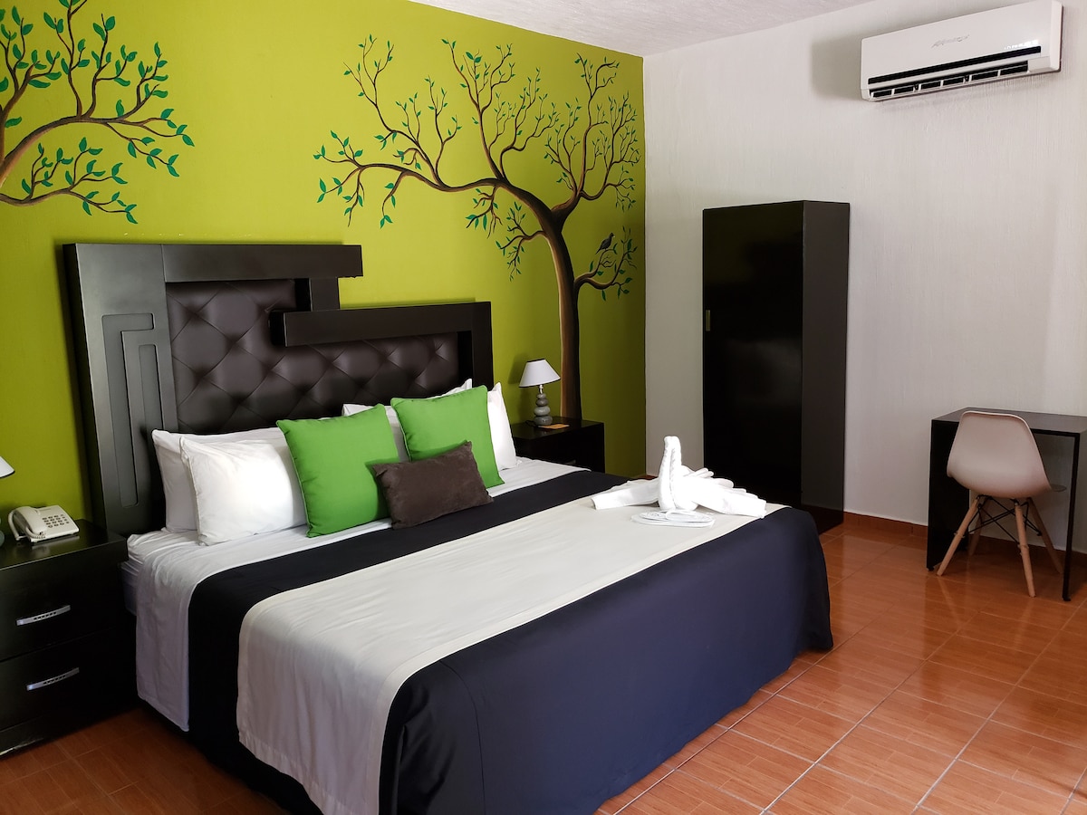 Relájate con toda la familia en este alojamiento donde la tranquilidad se respira. Nuestra casa es amplia, acogedora, con cuatro recamaras con suficiente espacio para ocho personas. Todas la recamaras cuentan con Aire Acondicionado para que tu estancia sea placentera Te encontraras dentro del fraccionamiento de Palma Real, donde encontraras silencio y mucha paz.