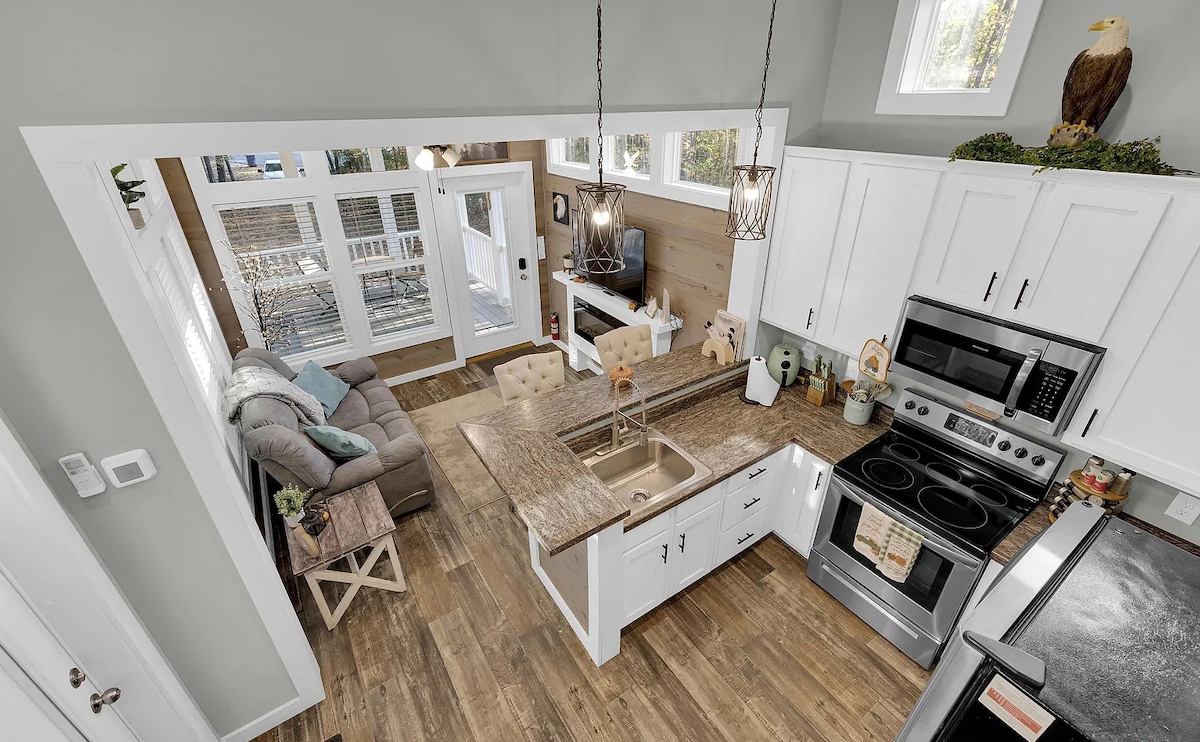 Entra en la minicasa frente al mar para encontrar una acogedora sala de estar con asientos reclinables y un televisor inteligente, ideal para las noches de cine o ponerte al día con tus programas favoritos. El dormitorio principal es un refugio tranquilo con una cama tamaño queen, mientras que el dormitorio elevado ofrece dos camas (tamaño king y queen) junto con su propio televisor de pantalla grande y tumbonas, lo que lo convierte en el refugio perfecto para huéspedes adicionales o incluso para niños a los que les encantará reclamar el loft como su escondite privado.