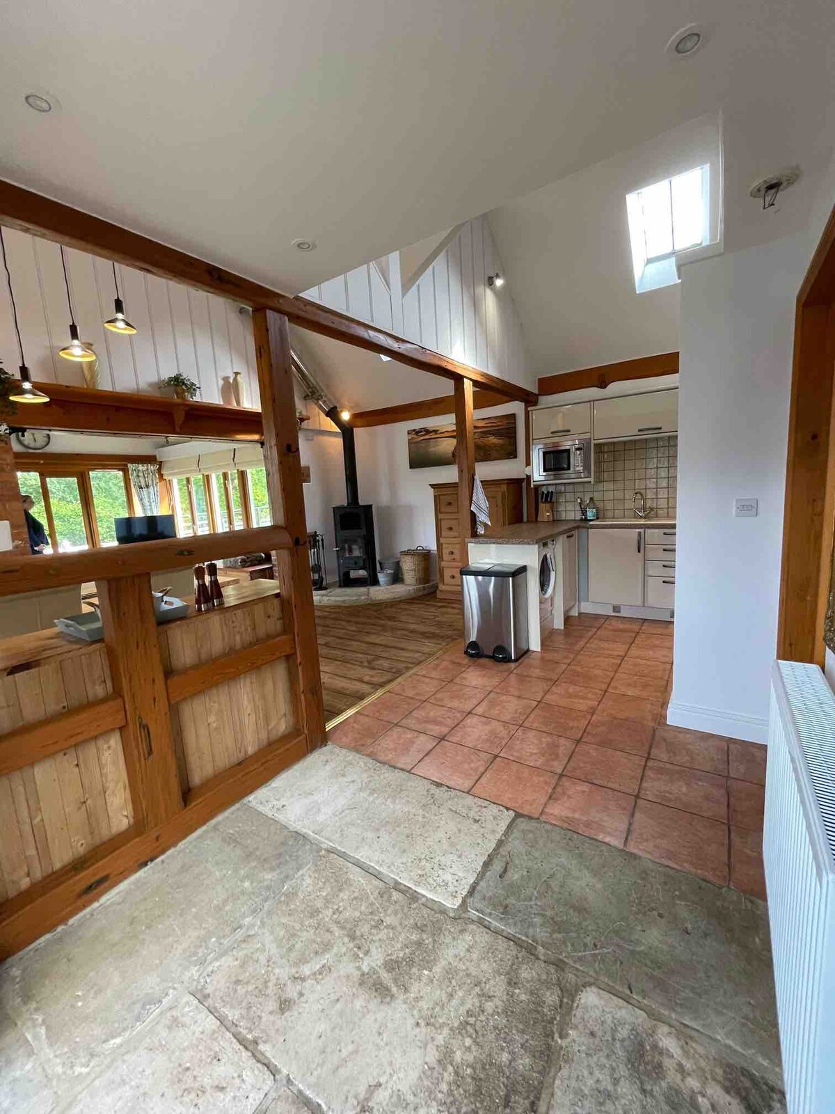 A beautifully converted chapel. Bright, spacious and lovely views from gallery, also a peaceful workspace. Wi-Fi. Pineapple Room with kingsize bed. Jungle Room twin beds or king. Lovely bathroom with shower over bath. Spacious family room with fully equipped kitchen, dining and lounge. Downstairs cloakroom. Designated onsite parking for one car. Enclosed garden ( access across car park through gate signed The Old Chapel Garden). Two housetrained dogs welcome, MUST book. No puppies.