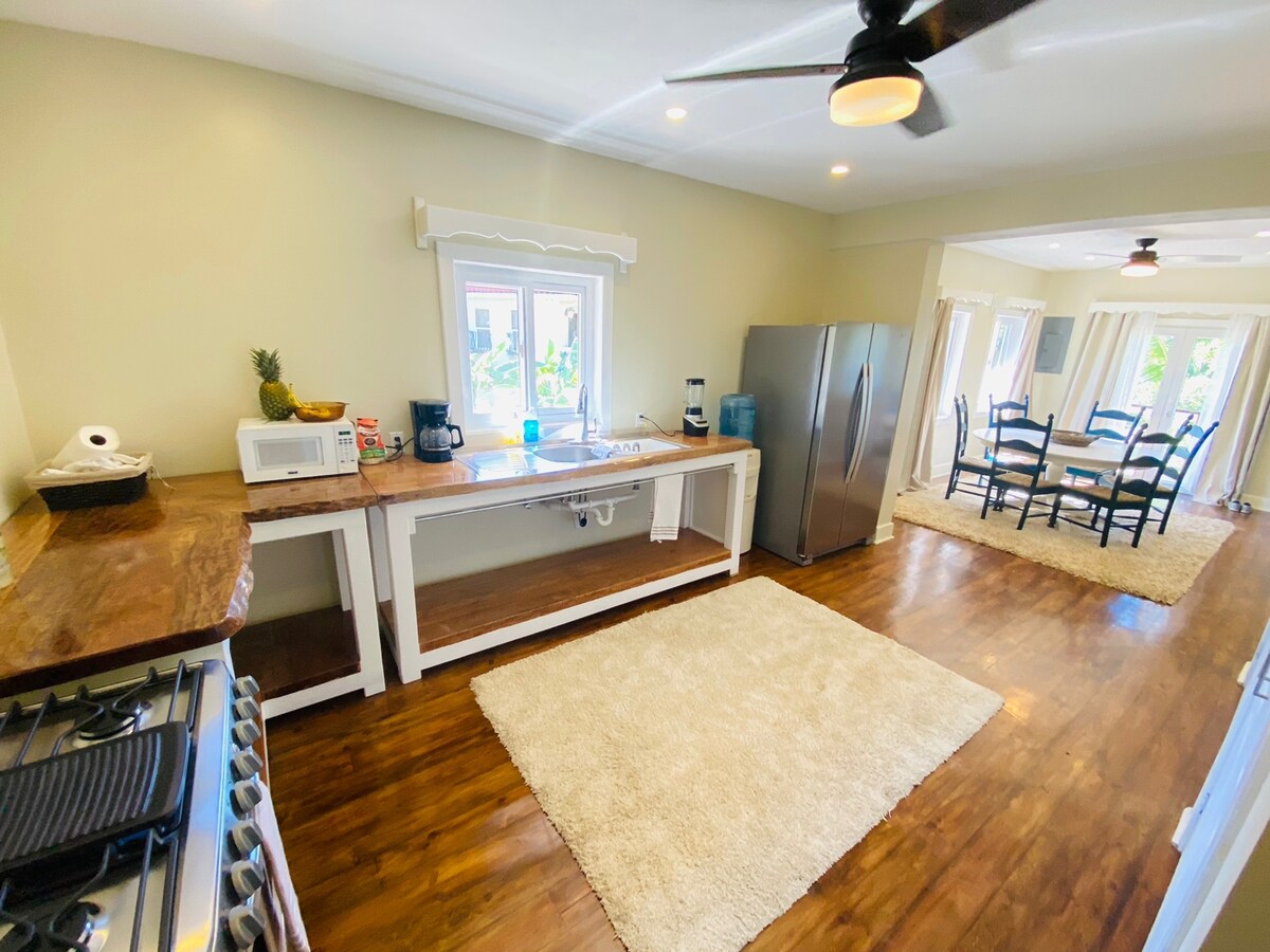 Frente a la playa entre el centro de la ciudad y West End Village, totalmente privada y segura. Cómodo y acogedor. Disfruta de la verdadera experiencia isleña, toma una canoa o surf de remo y rema a unos 200 pies para practicar esnórquel de clase mundial o camina por la playa al atardecer e interactúa con los lugareños e interactúa con los lugareños, observa un buen partido de fútbol....... Compra la captura del día del pescador local justo en pies, y cocina en tu cocina totalmente equipada o barbacoa con vistas al mar/jardín a la barbacoa. Restaurantes, supermercados...... distancia a pie o en auto corto.