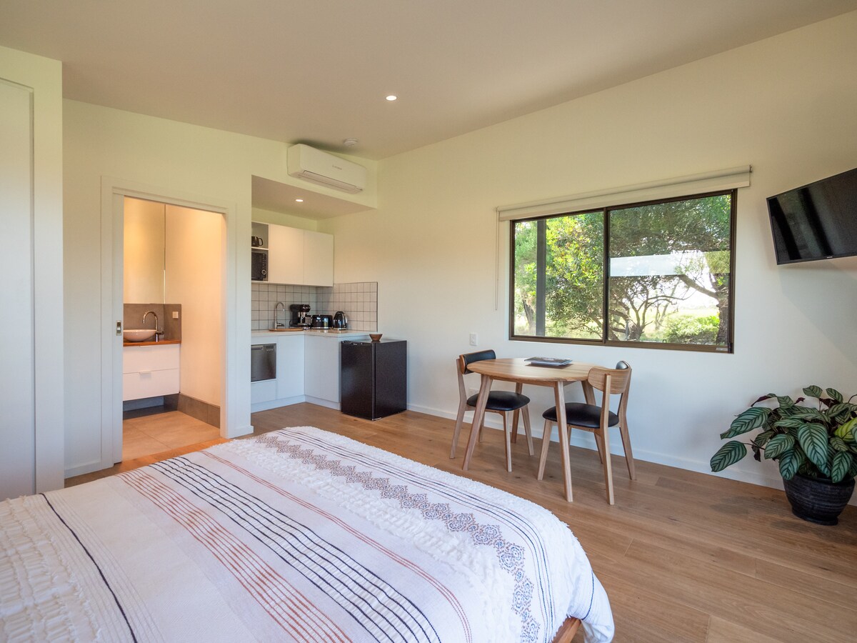 Coastal-modern private guesthouse studio space, only 500m from stunning Surf Beach, Phillip Island. Fully self-contained, detached from main house, access via side entrance, free off-street parking . Separate bathroom & fully functional kitchen. Edible garden space, outdoor verandah & firepit. Walking distance from a bottle shop & pizza & coffee vans, public transport & bicycle tracks. Perfect for couples, safe for singles, welcoming to LGBTQIA+, seniors & …dog friendly! (Sorry no cats)