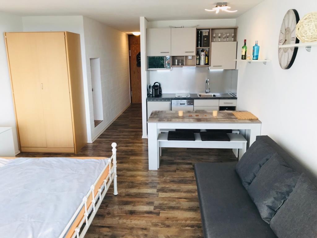 Apartamento recién reformado, decorado y diseñado con mucho cariño, una mezcla de estilo Space Age y minimalismo. Impresionantes puestas de sol y cielos, con vistas a los Alpes cuando el cielo está despejado. El apartamento se encuentra en un gran complejo vacacional de los años 70 que en su día fue pionero en el mundo de la arquitectura (el mundo de la construcción de 1973 se encuentra en el apartamento). En verano, con hamaca y piscina al aire libre; en invierno, con piscina cubierta y saunas. También hay un gimnasio en el edificio. Todo incluido.