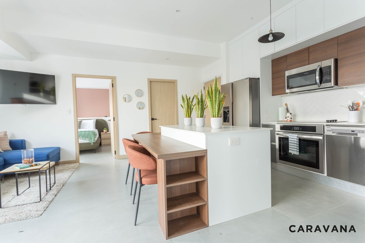 Disfruta de la tranquilidad de este alojamiento céntrico. Muy cerca de la zona 10 (zona viva), con capacidad para 5 personas. Ideal para descansar, o familiar con niños. Dos dormitorios, uno con cama queen y el segundo con dos camas individuales. En la sala con un sofa muy cómodo para otro huésped. El edificio cuenta con: -Kids place (juegos) -BBQ corner -Co working space -Social room -Terrace Lounge -Total Workout Gym -Pet Zone - Fire pit place