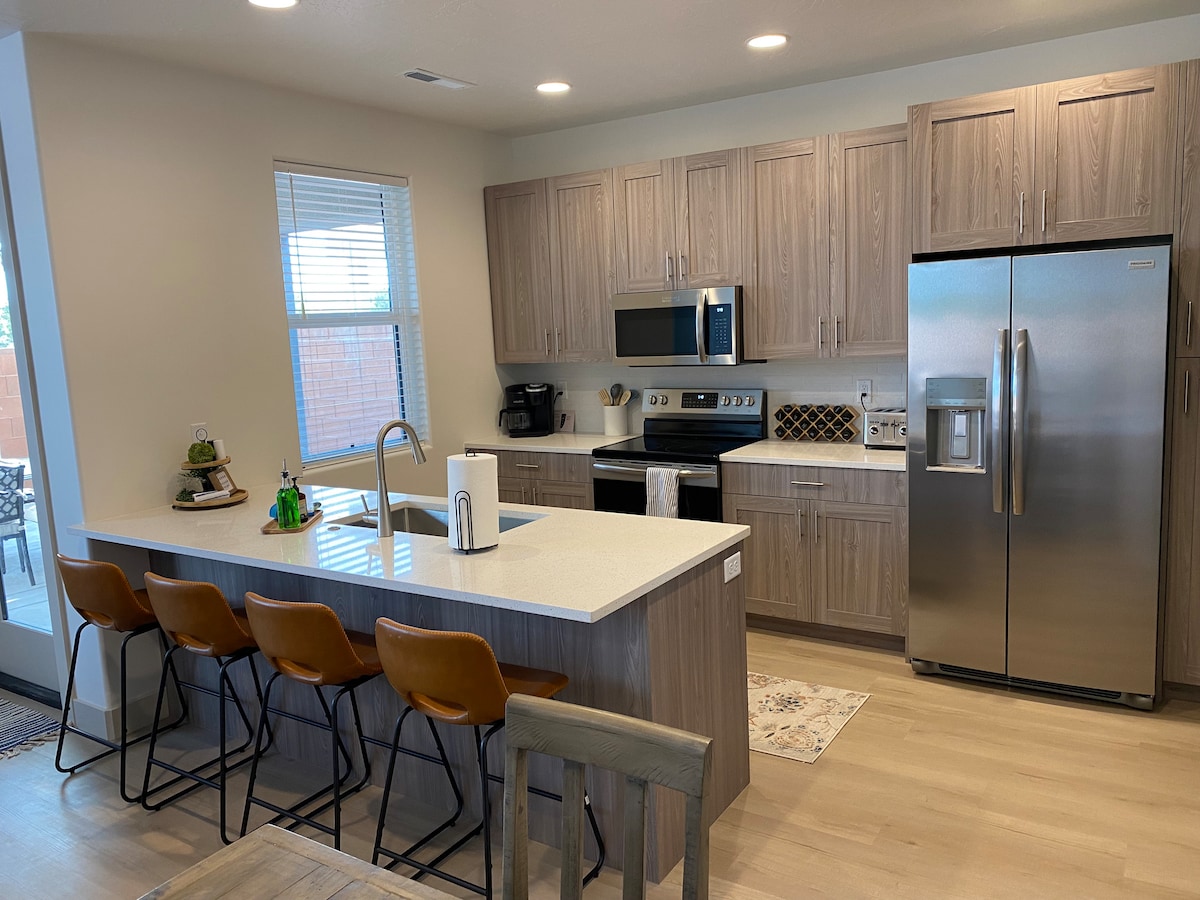 Lujosa casa de dos pisos con 3 dormitorios y 2,5 baños. Cocina contemporánea totalmente equipada. Dos habitaciones familiares, chimenea, garaje para 2 coches con puerto de carga de vehículos eléctricos de 50 amperios. Patio al aire libre para asar a la parrilla, cenar bajo las luces del café o asar s'mores sobre la mesa de fuego. A pocos minutos podrás practicar senderismo, ciclismo, paseos a caballo, rutas en todoterreno y visitar el anfiteatro Tuacahn, ¡y el centro acuático Sand Hollow está justo enfrente! Las canchas de piscina y pickleball están disponibles para todos los huéspedes. ¡Ven a disfrutar hoy!