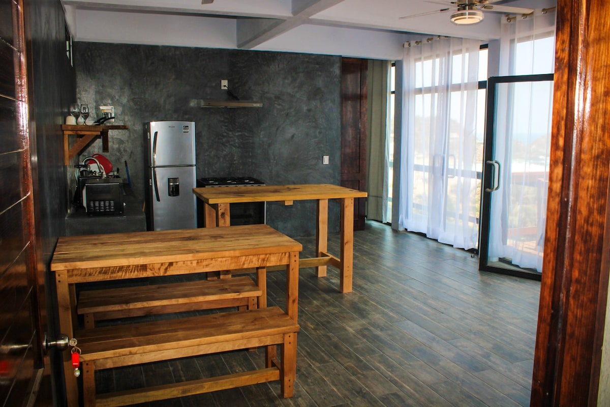 Casa Coco, está localizada en una zona muy tranquila, ideal para contemplar el amanecer y ver el sol y la luna salir por la montaña. De la calle principal a casa coco deberas de subir 61 escalones si vienes caminando, tambien contamos con acceso vehicular y estacionamiento sobre la calle. La casa esta equipada con una recamara con cama king y AC, internet Starlink de alta velocidad,baño privado, agua caliente, cocina, comedor, escritorio, una fresca sala con vista al mar y terraza con Jacuzzi.