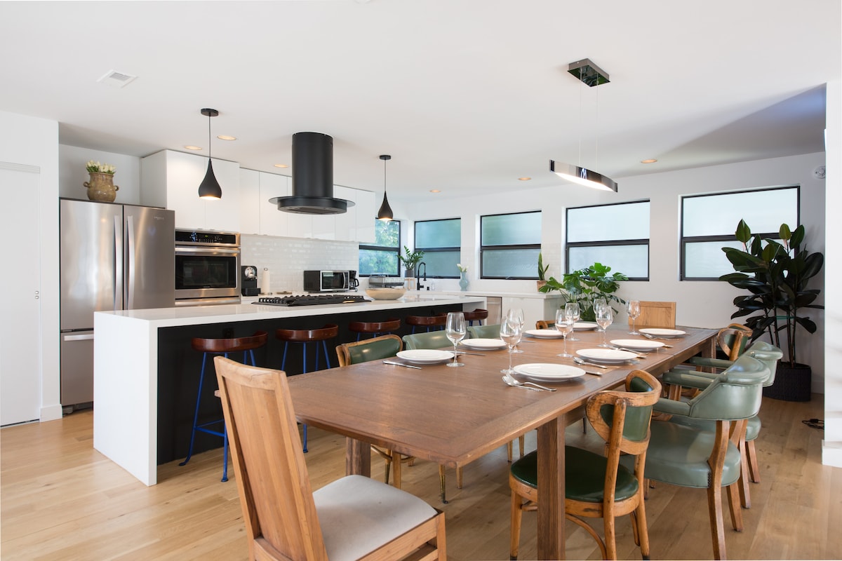 Contempla la puesta de sol desde la azotea de esta joya arquitectónica moderna. Relájate junto a una cascada zen en un espacio de diseño industrial fluido de interior a exterior con puertas de vidrio del patio del suelo al techo, dos fogatas y decoración y arte coloridos. Los niños menores de 18 años no cuentan en el límite de ocupación publicado, por lo que, por ejemplo, se permitirían 8 adultos más varios niños. Hay cuatro camas plegables portátiles de primera calidad que no se muestran en las fotos y que caben en cualquiera de los espaciosos dormitorios o en la sala de estar, lo que eleva el total de camas a 9. URBAN LOFT es como se siente la «sala de estar». Perfecto para grupos grandes y eventos porque toda la planta baja es un gran espacio abierto (aproximadamente 1000 pies cuadrados). La mitad del espacio está abierto y se puede configurar con mesas, esterillas de yoga y asientos. El sofá extragrande y las otomanas tienen capacidad para diez personas y están frente a un televisor de pantalla plana grande y una chimenea de gas. Las enormes puertas correderas de vidrio se abren a un gran patio privado y cuentan con muebles personalizados con capacidad para diez personas y rodean un pozo de fuego de gas. La COCINA DEL CHEF cuenta con una cocina Viking de 6 quemadores y todo el equipo de cocina que puedas necesitar, vajilla para 12 personas, con mucho espacio para chefs y proveedores de comida. La mesa de comedor tiene capacidad para diez personas y hay dos mesas plegables y sillas disponibles para ampliar la capacidad en ocho. ¡Abre las puertas correderas de vidrio y escucha los relajantes sonidos de una pared de agua zen! Dos barbacoas de carbón tradicionales abovedadas Weber de 22” para asar a la parrilla. SISTEMAS DE ENTRETENIMIENTO: Hay televisores grandes de pantalla plana en la sala de estar, la suite principal y el dormitorio delantero de invitados, e incluyen cable y contenido premium. Transmite tu propio contenido o reproduce tu biblioteca de Apple a través de Apple TV en el sistema de la sala de estar. Para presentaciones de PowerPoint o cualquier contenido reproducido en tu ordenador portátil, puedes conectar tu ordenador portátil al televisor mediante un cable HDMI (trae el tuyo propio). Para la música, el gran Bose Sound Dock está en la sala de estar. Reproduce tu música a través de dispositivos habilitados para Bluetooth. También hay canales de música disponibles en DirecTV. ¡El DORMITORIO PRINCIPAL es lo suficientemente grande como para ser un apartamento! Cuenta con baño privado con bañera con profundidad, balcón privado, sala de estar separada con TV y sofá, y silla colgante de burbuja (lugar ideal para #instagram). LOS DOS DORMITORIOS DE INVITADOS comparten un baño. Dos camas tamaño queen están en una, una cama tamaño king y dos camas individuales en la otra. Las opciones para dormir son flexibles; mueve cualquiera de las cuatro camas plegables portátiles a cualquiera de los dormitorios, o incluso a la sala de estar. Para que quede claro, hay tres dormitorios privados y la casa funciona mejor para grupos grandes que son flexibles en sus arreglos para dormir. Los números de capacidad suponen que dos personas compartirán las camas tamaño queen y king. . Los BEBÉS Y NIÑOS PEQUEÑOS son bienvenidos, y tengo una cuna portátil y dos sillas altas. Pero, ten en cuenta la siguiente sección sobre las escaleras: ESCALERAS: La casa es de construcción moderna y tiene largas escaleras de hormigón y acero que conectan la sala de estar con el nivel del dormitorio de arriba. Estas pueden ser una preocupación para las personas mayores o para los niños muy pequeños o rebeldes. Hay una puerta de seguridad disponible para la parte superior de las escaleras principales, que se instala bajo petición. La TERRAZA DE LA AZOTEA es una terraza totalmente privada en el tercer piso, con vistas de 270 grados, un vistazo al letrero de Hollywood, tumbonas para cuatro personas, sofá para diez personas, todo ello alrededor de un pozo de fuego de gas. Es un lugar estupendo para tomar el sol y pasar el rato, ver la puesta de sol o beber cócteles junto al fuego. Debido a las restricciones de ruido, no se permite el uso de huéspedes después de las 22:00 horas. APARCAMIENTO: Caben dos coches en la entrada. También tienes uso exclusivo de dos plazas de aparcamiento más en la calle, paralelas a la puerta del garaje. (Excepto el martes por la mañana de 8:30 a 10:30, horario de barrido de la calle). En general, este barrio tiene un amplio estacionamiento en la calle, excepto durante los fines de semana de verano o los días cálidos de invierno. Durante esos momentos, cualquier coche que supere los cuatro puede aparcar (incluso durante la noche) en los aparcamientos públicos cercanos: el número 9 en 14031 Palawan Way o el número 13 en 4601 Via Marina, en Marina Del Rey. AUTOREGISTRO: La casa cuenta con una cerradura electrónica en la puerta principal. Dos días antes de tu llegada te enviaré el código que la desbloquea y podrás entrar en cualquier momento después de las 16:00 h del día de tu llegada (o de las 13:30 h para dejar el equipaje). Las instrucciones de la casa y las contraseñas del wifi están publicadas en la cocina. LLEGADA ANTICIPADA y SALIDA DESPUÉS DE LA HORA ESTABLECIDA Esta es una solicitud frecuente y, dado que la casa está alquilada casi al 100 %, generalmente es imposible de aceptar. La casa tarda cinco horas en limpiarse entre la salida a las 11:00 y la llegada a las 16:00. Sin embargo, si no te importa ver una casa desordenada, puedes dejar el equipaje después de las 13:00 h. Del mismo modo, si vas a salir y tienes un vuelo tarde, puedes dejar el equipaje junto a la puerta principal hasta las 12:30 h. REQUISITO DE ESTANCIA MÍNIMA. Recibo muchas más solicitudes de alquiler de las que puedo manejar. Necesito llenar todas las noches de la semana, así que tengo algunas pautas que determinan qué solicitudes de alquil