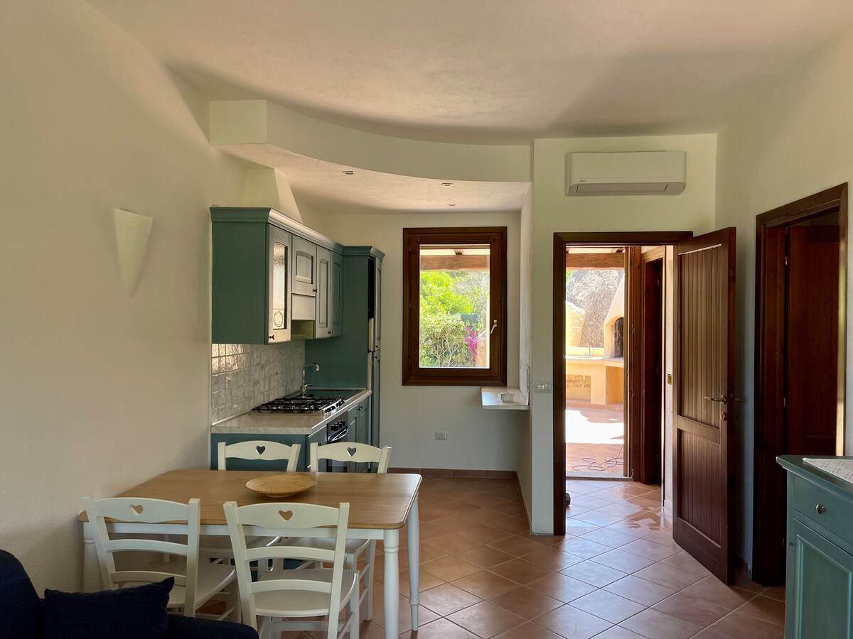 Departamento frente al mar, con entrada independiente y jardín privado. Dispuesta en dos niveles, totalmente renovada, sala de estar con sofá cama doble (1 cuadrado y 1/2), cocina americana, gran terraza con impresionantes vistas al mar (¡180°de mar!) desde la que ver encantadoras puestas de sol, dormitorio doble con balcón con vistas al mar, solárium y en la parte trasera del jardín privado situado hacia las rocas de granito de Gallura. Wifi. Caja de llaves. Toallas y sábanas adicionales € 20 por persona.