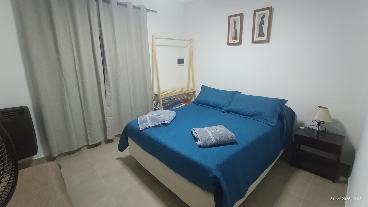 La Pausa Acogedor dpto totalmente equipado, ideal para estadías cortas. Cuenta con dormitorio con ropa de cama, baño privado con agua caliente y toallas, amplio living comedor con sofá cama, cocina integrada con elementos básicos y estacionamiento propio. aire acondicionado en todos los ambientes. Su patio y espacio de asador se destacan por un caldén centenario que lo hace único, brindando un entorno natural y especial. Perfecto para viajes de descanso o trabajo en una ubicación accesible.