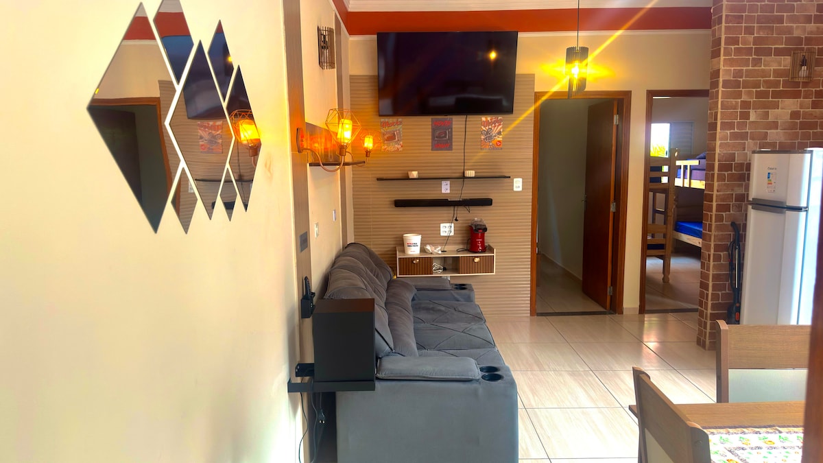 Melhor custo benefício para receber até 7 pessoas Você aluga a casa completa pois não é compartilhada -Fibra WiFi 650 megas e Smart Tv LG 4k 55 polegadas com soundbar cinema JBL. Quarto de casal cabem 2 pessoas e com treliche 5 pessoas mais um colchão a parte. Fogão com gás e microondas, churrasqueira eletrica e a carvão. Garagem espaçosa para 3 carros Se precisar forneço roupa de cama e banho. Solicite um orçamento para estadia a partir de 1 mês para mais de 2 pessoas.