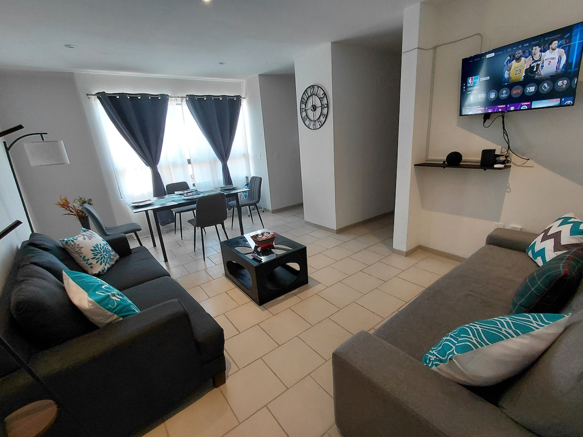 Amplio departamento nuevo de 160 m2, ubicado en el corazón de Juriquilla ofrece una experiencia única, con increible tecnologia, iluminacion, amenidades y entretenimiento. Si busca lo mejor, no busque más y venga al departamento más moderno y lujoso de Querétaro para una estancia inolvidable Caminando del Starbucks, Walmart, bares y los mejores restaurantes como Sonora Grill & Hunger, este departamento lo tiene todo, camas cómodas, amplio balcón, TVs 4K OLED y Home-Cinema de 100" desde su cama