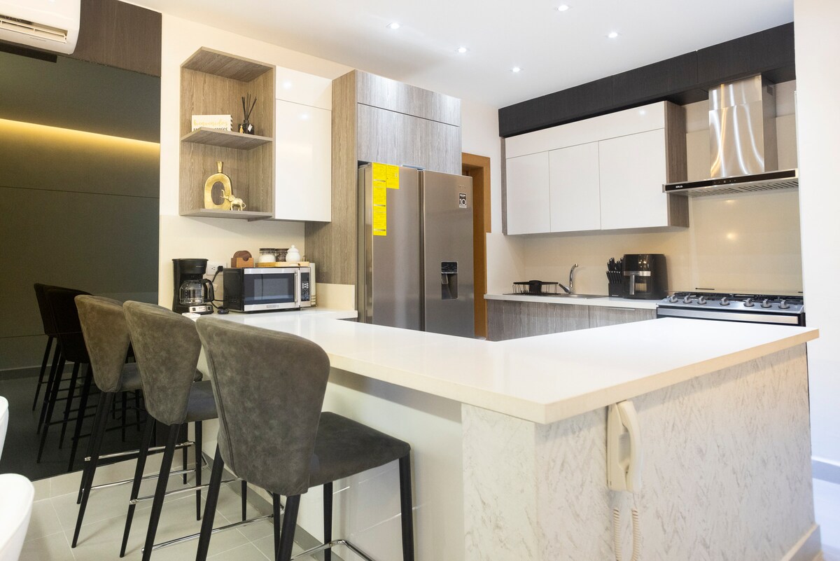 Diviértete con toda la familia en este elegante lugar. Con la privacidad y los servicios necesarios para tener momentos inolvidables, tiene una cocina completa, baño completo en las dos habitaciones principales, la otra habitación tiene un baño de servicio. Tenemos aire acondicionado en Sala principal siempre que haya electricidad, hay ventiladores en la pared y ventilador de techo en la sala de estar. Ingrese con un código de acceso # ¡Es un cuarto piso, no hay ascensores! Pero ofrecemos ayuda con el equipaje siempre que me avises con anticipación.
