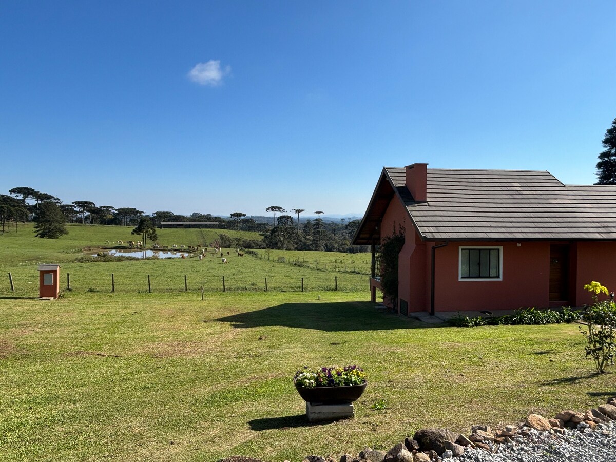 Chalet para hasta 8 personas con cocina completa y parrilla, con amplio balcón, chimenea en el balcón, con vista a un lago, TV por cable, chimenea, a 10 km del centro de la ciudad y a 3 km del supermercado, lugar para caminar junto a la naturaleza y ruta de ciclismo que pasa por delante. Tenemos wifi en la casa. Oficina en casa. Puede disfrutar del sitio con quiosco y bote de pedales. Casa de muñecas para niños. Visualice en las redes sociales de Sítio Vale do Lago