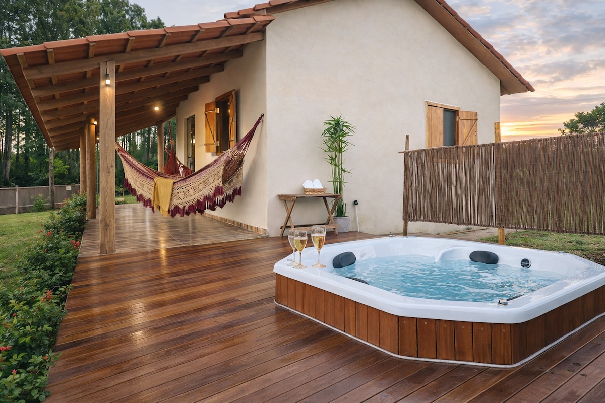 Hermoso chalet con jacuzzi, bien ubicado, perfecto para aquellos que les gusta la tranquilidad, a 7 minutos de la avenida principal. Nuestro espacio está pensado para experiencias en pareja, con varios rincones acogedores, llenos de detalles que marcan la diferencia. Terreno totalmente vallado, lo que proporciona más privacidad. 🛌🏼Cama tamaño queen 🛁Ofurô 📺TV inteligente 🛜Wi-fi 450MG 🎶Alexa 🌬️Ventilador 🎐Secador de pelo ☕ • Cafetera 🥞 Desayuno opcional 🐾 Se admiten mascotas (selecciona la mascota para reservar) 🔥 Zona de hogueras