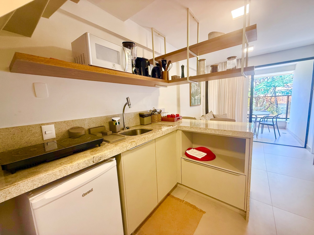 Ideal para quienes necesitan internet rápido, muy buena ubicación cerca del centro de la playa de Xepa y la playa de Maceió, cocina equipada con minibar de 127 l, cocina de 2 hornillas, licuadora, sandwichera, aire acondicionado de 12 mil btus, cafetera dolce gusto, smart tv, caja fuerte y estacionamiento. El espacio con cama queen en el entrepiso y un sofá cama en la sala. Baño con ducha eléctrica y secador de pelo, ya viene juego de toallas de baño y cama. Balcón con mecedora y tumbona.