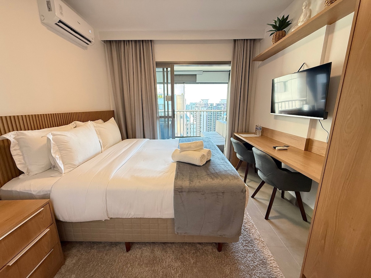 Nuevo estudio con vistas panorámicas — ¡24ª planta con piscina infinita y estilo! Disfruta de São Paulo con comodidad y estilo en nuestro estudio, cuidadosamente preparado para darte la bienvenida. Ubicado en la planta 24 con *vista de cristal de 180° de la autopista Pinheiros*. Un refugio moderno, ideal para quienes buscan practicidad, comodidad y una experiencia única en la ciudad.