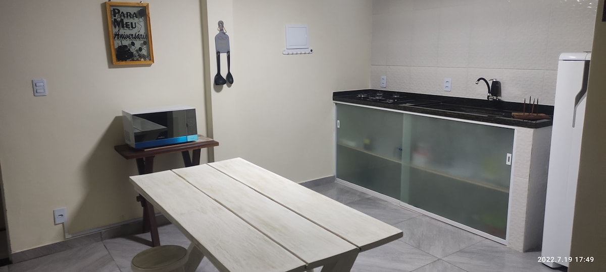 Dúplex (tenemos 4 unidades) Primer piso con sala de estar y cocina completa con balcón. Suite del segundo piso con cama doble y litera. Aire acondicionado dividido. Vista gratuita Se admiten mascotas. Wifi gratuito. Tienda cerca. A 250 metros de la playa (a 3 minutos a pie). A 15 minutos (a pie) de Itaúna Stone y Point (wsl).