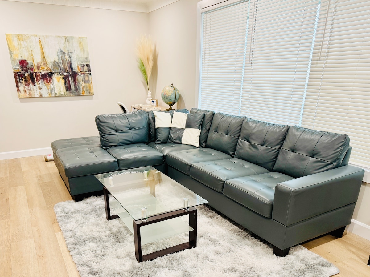 This peaceful corner lot home features a private garage with smart lock self-check-in and a 24/7 security camera at the entrance. Inside, enjoy an 80" TV with luxury furnishings. The patio includes furniture and a BBQ. The master bedroom has a king-size bed, and there are two additional bedrooms in the basement, each with a queen bed. The spacious living room sofa sleeps two. The kitchen boasts a fully equipped 10-foot island in an open-concept design. Central heating/cooling ensures comfort.