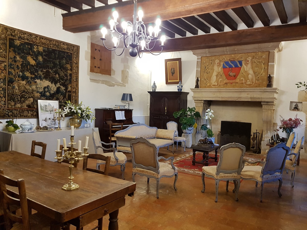 Esta suite está situada en el ala de un castillo del siglo XV en el corazón de Anjou: este edificio de carácter, reflejo del patrimonio angevino, seducirá a los románticos y amantes de las piedras antiguas. Totalmente restaurado, este alojamiento (entrada privada) está equipado con instalaciones nuevas y de calidad, con un buen aislamiento acústico y térmico, templado tanto en verano como en invierno; y, por último, con una vista panorámica de los campos circundantes y de los fosos del castillo.