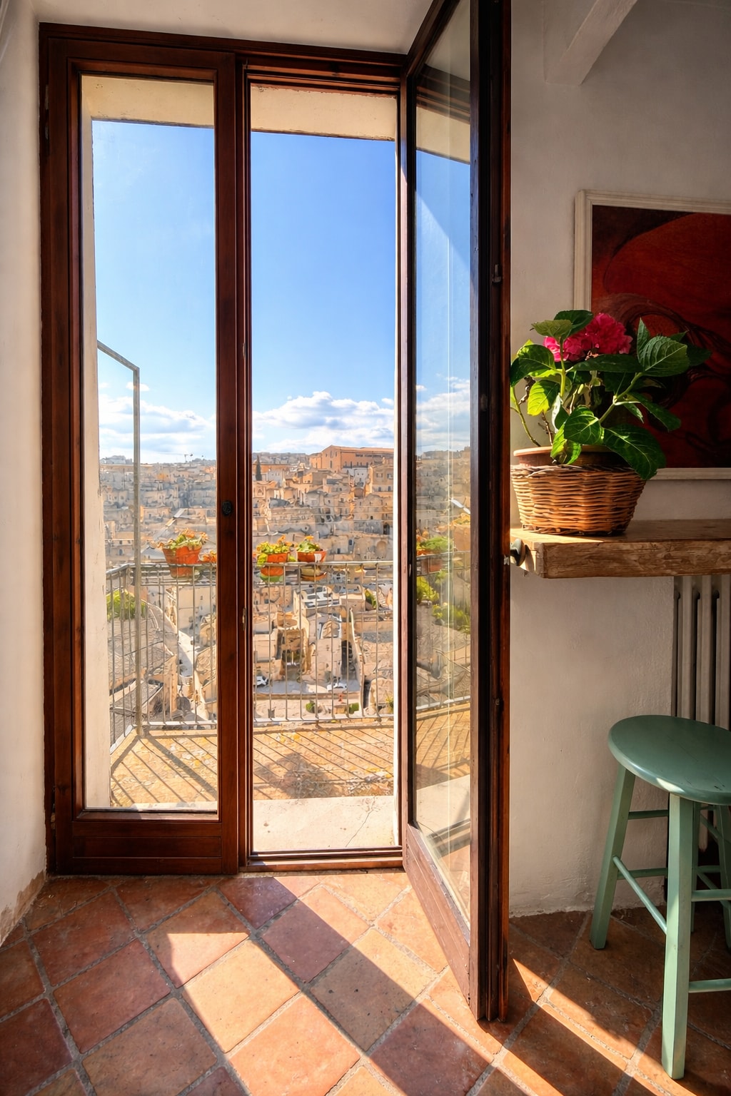 La casa, que forma parte de un edificio de finales del siglo XVII, se encuentra cerca de Via Casalnuovo, en la parte superior del Sasso Caveoso. Se encuentra en una posición privilegiada, en el silencio de los Sassi, pero a 300 metros de la zona peatonal donde caminar por el centro histórico de la ciudad en pocos minutos a pie se puede llegar a los lugares más interesantes de la ciudad. Es posible estacionar el auto en la calle, a pocos minutos a pie desde la casa o en un estacionamiento vigilado a un costo de unos 10 euros por día.