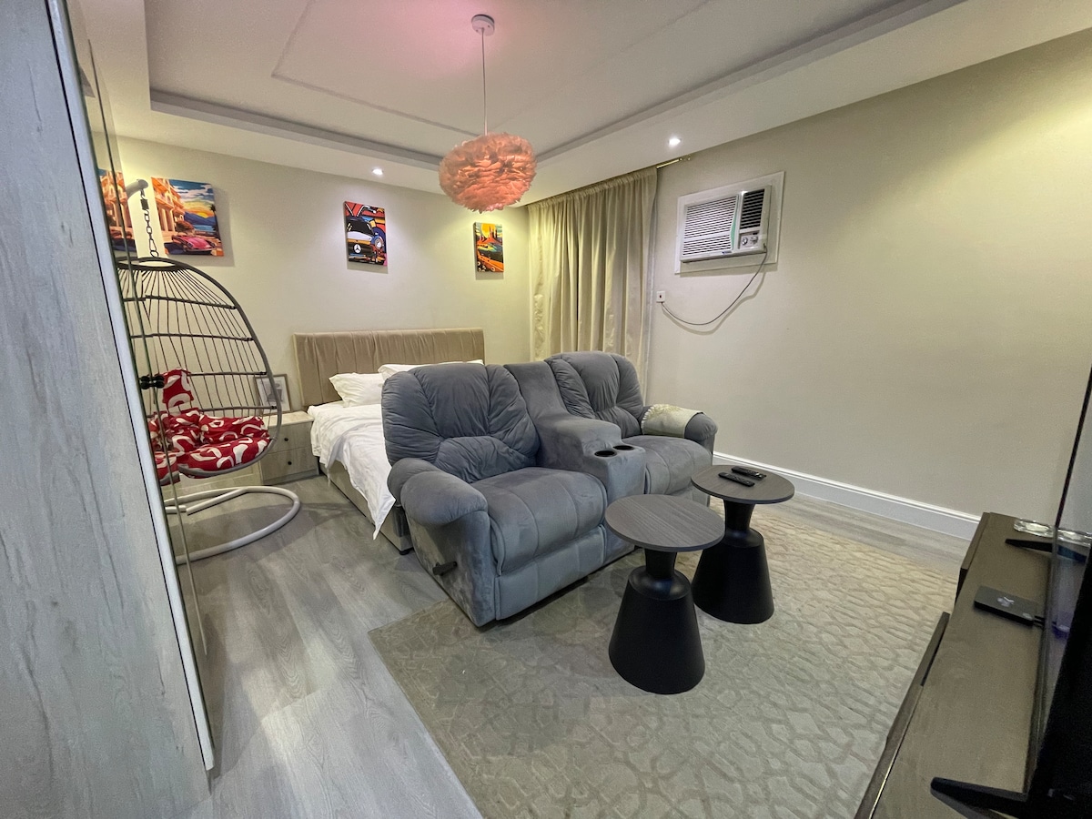 Elegante estudio en el distrito de Al Aqiq, totalmente equipado con todas las comodidades, con entrada inteligente y una ubicación privilegiada con fácil acceso a los principales destinos de Riad. A 8 minutos del Boulevard A 8 minutos de la tierra de las bestias A 7 minutos de KAFD A 18 minutos del aeropuerto. A 6 minutos de la Universidad Rey Saud Internet 5G de alta velocidad ilimitado disponible Pantalla de 70 pulgadas