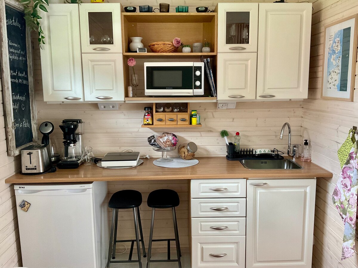 ¡Le damos una cálida bienvenida a Vaahterankukka en Halssila, Jyväskylä, una zona residencial única e idílica! Vaahterankukka es una casita de color rosa adorable de cien años en nuestro patio. En verano, verá arces verdes y ramas de abedules en el patio a través de las ventanas, mientras que en invierno, el hielo del cercano lago Jyväsjärvi brilla en el horizonte. Como huésped, puede disfrutar de la tranquilidad de la pequeña casa. Desde la autopista, puede llegar a nuestro destino en coche en unos minutos.