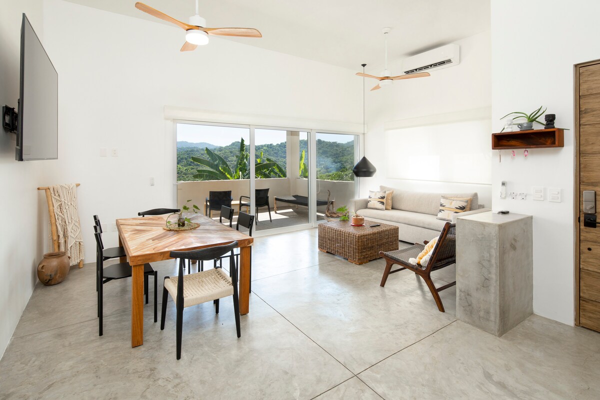 Despiértese con vistas exuberantes a la selva en este relajado refugio bohemio para surfistas, con una terraza privada al aire libre perfecta para tomar el café por la mañana o contemplar el atardecer después de surfear. Ubicado a solo unos minutos a pie de la playa y del centro de la ciudad, tendrá fácil acceso a lugares para practicar surf, restaurantes, tiendas y vida nocturna. Este alojamiento, acogedor pero espacioso, cuenta con una cama king, cocina completa, sala de estar interior y exterior, y una decoración cálida y natural. Tabla de surf incluida sin costo adicional con su estadía. Ideal para surfistas, parejas y estancias prolongadas.