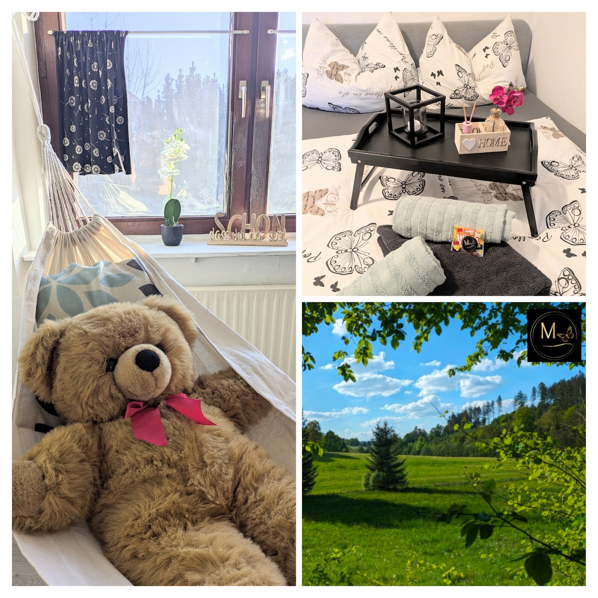 Small holiday apartment with exceptional amenities in 40 square meters. Enjoy an unforgettable stay in a rustic vintage setting. The cozy atmosphere includes a living room, fully equipped kitchenette, bathroom with shower, and a small bedroom. All necessary amenities are provided, including a swing, indoor trampoline, raclette grill, and more. The area is surrounded by lakes, fields, and forests. Children and pets are welcome.