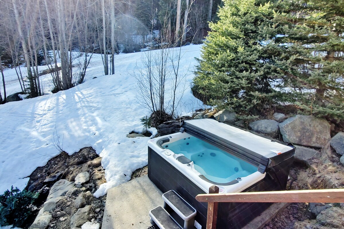 Chapotea en la bañera de hidromasaje al aire libre junto a la ladera y el arroyo mientras te sumerges en Hermosas vistas a la montaña. Acomódate en PINETREE CHALET. • 6 dormitorios: ropa de cama prémium • 6 camas tamaño queen + 6 camas individuales • 5 baños • enorme mesa de comedor para 16 • área de bebidas: 2ª nevera completa • salas de estar y familiares principales con capacidad para 14 personas • aparcamiento, wifi rápido, barbacoa • entrada cubierta y con acceso directo a las pistas de esquí • 2 vestíbulos de engranajes "... mucho espacio. vistas increíbles. ubicación muy conveniente. la cocina de airbnb mejor equipada que hemos tenido...» (revisión en línea)