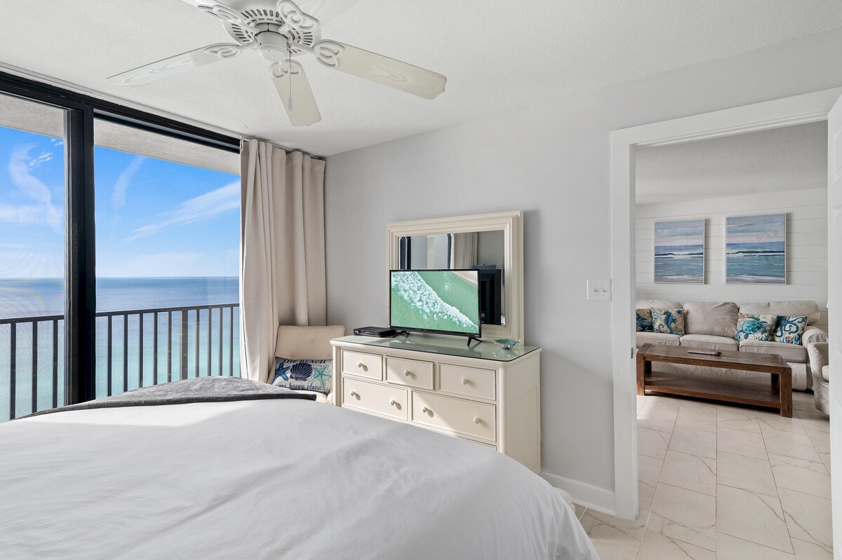 Este apartamento cuenta con una cocina totalmente equipada con encimeras de granito, electrodomésticos de acero inoxidable y todos los utensilios de cocina necesarios. El dormitorio tiene una cama tamaño king y baño completo adjunto. Se proporciona espacio adicional para dormir con un sofá cama tamaño queen en la sala de estar. Sal a tu balcón privado y disfruta de las impresionantes vistas del centro vacacional y del golfo de México. Contempla la puesta de sol sobre el agua o relájate con tu café de la mañana y escucha las olas.