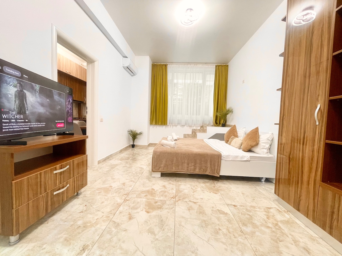 Bienvenido a su escapada urbana en Bucarest. Un estudio moderno, perfecto para exploradores, viajeros o trabajadores remotos. Disfruta de una cómoda cama de 160 cm en una zona de descanso independiente, además de una acogedora sala de estar con sofá. La cocina totalmente equipada incluye una barra de desayuno, ideal para el café de la mañana o una comida relajada. El baño cuenta con una ducha a ras de suelo. Situado en una zona tranquila, con transporte público rápido para acceder fácilmente al centro de la ciudad y a todos los lugares de interés. Siéntete como en casa, lejos de casa.