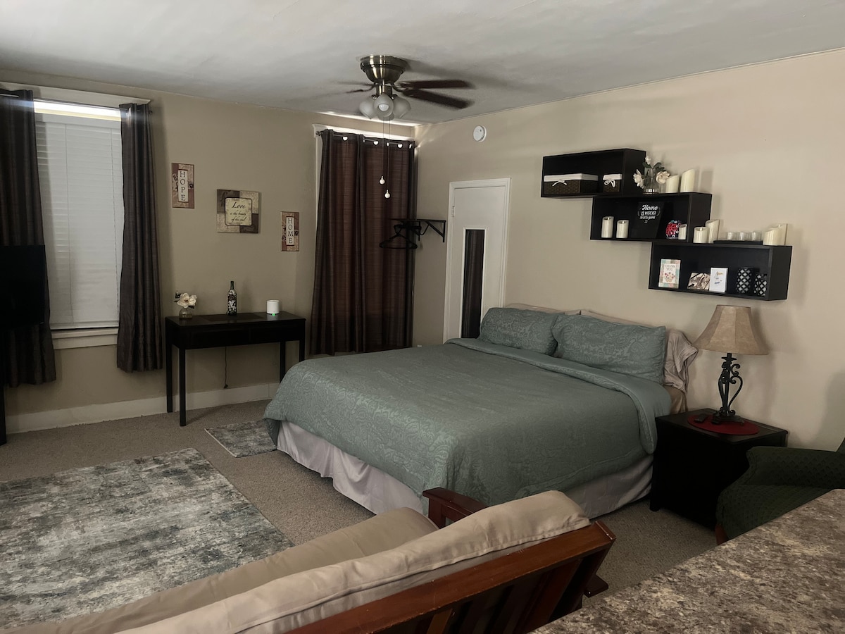 Acogedor estudio Windsor ideal para pasar la noche o una semana, pero también ideal para enfermeras que viajan, estancias de media duración o alojamiento de seguros. Cuenta con una cama tamaño queen, dos camas plegables, Roku TV, cocina completa y lavandería separada con lavadora/secadora. Aparcamiento seguro para bicicletas en el interior. Fácil acceso a Katy & Rock Island Trails. A una manzana del centro de la ciudad con estacionamiento fuera de la calle. Tranquilo, limpio y perfecto para estancias largas o escapadas de fin de semana.