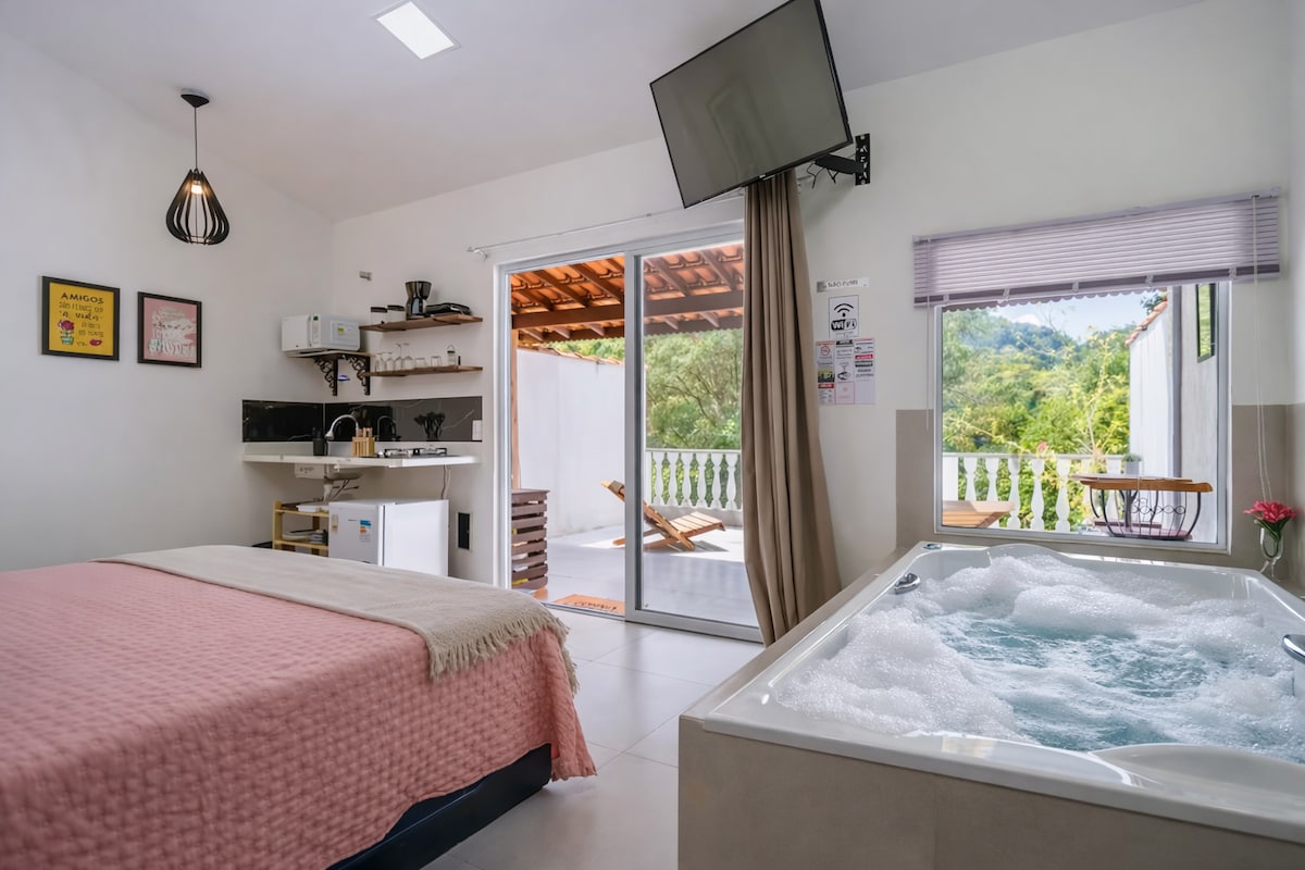 Fica no Condomínio All Suites. O quarto possui frigobar, excelentes colchões, roupa de cama e banho bem cuidadas, ar condicionado split, sem barulho de carros. Com direito a uma belíssima Piscina/Spa privativa ! Dá para ir a pé ao Parque Municipal (Rock The Montain), Supermercado, Shoppings, farmácias, restaurantes, cafeteria, banca de jornal, e outros comércios. Abrace a simplicidade e a comodidade neste lugar tranquilo e bem localizado