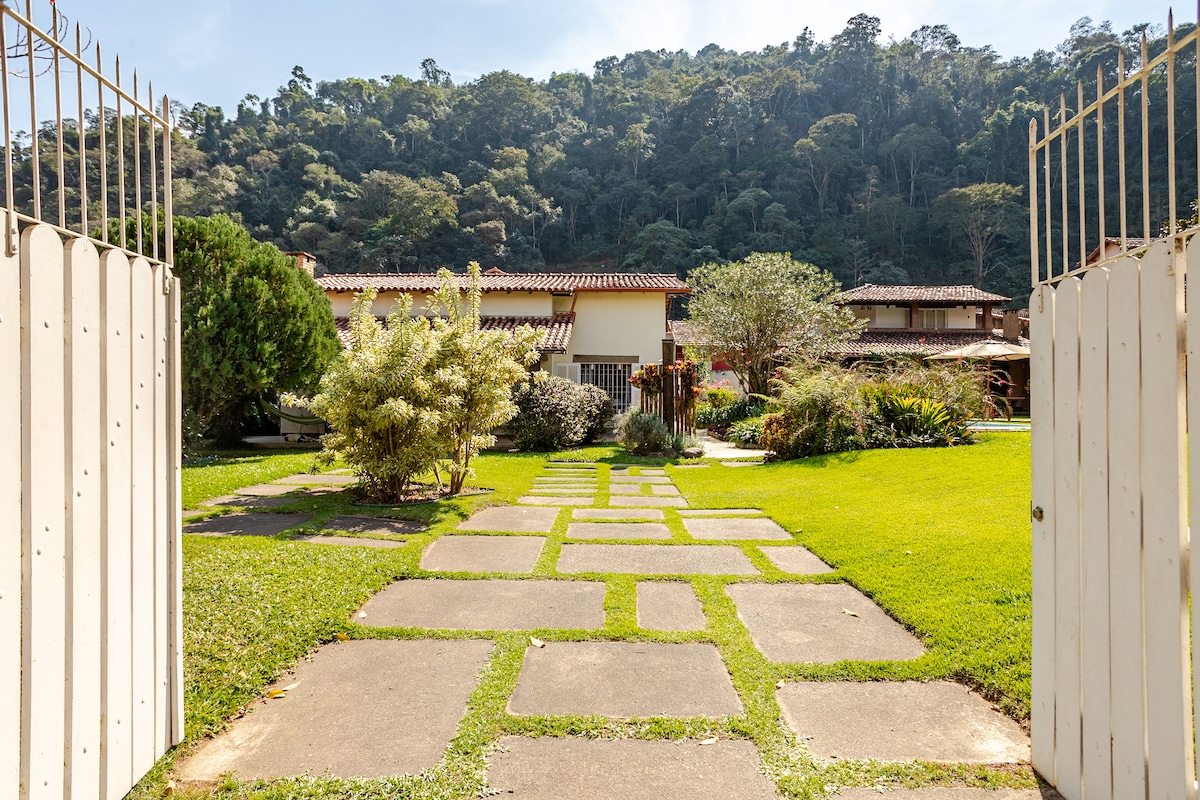 Hermosa casa de estilo loft en uno de los lugares más bellos de Petrópolis a 1250 metros de altitud en medio del bosque, en un lugar seguro dentro de un sitio privado con dos casas más. Fácil acceso, con vistas privilegiadas a Pedra da Cuca, junto a la reserva biológica de Araras (rebio), cerca de la cascada de la puente funda, con Wi-Fi disponible, zona de fogata, carramanxão y piscina.