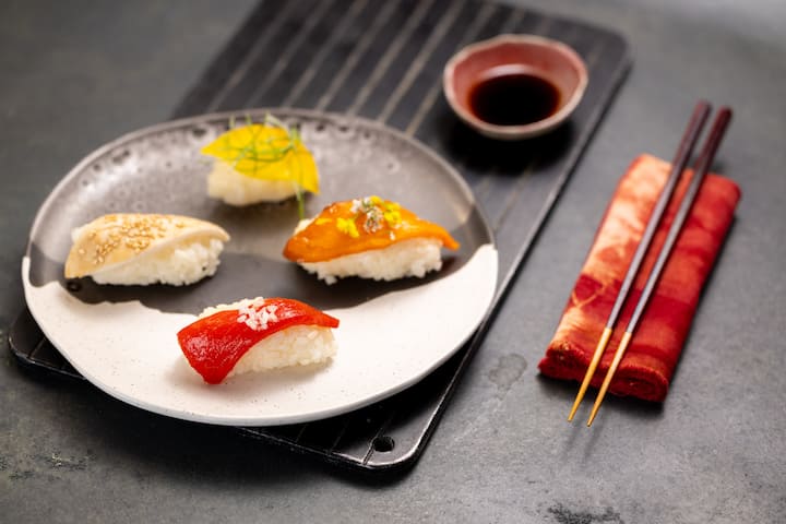 Disfruta de un elegante festín de sushi al estilo nigiri. Este menú de origen vegetal se prepara en un alojamiento en Airbnb o en una casa y tiene capacidad para un máximo de 6 participantes.