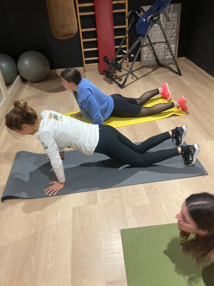 Esta propuesta incluye ejercicios de fuerza ideados para llegar a un objetivo marcado. Trabajamos con pesas y gomas para tono muscular, postural, movilidad de articulaciones para flexibilidad y fondo.