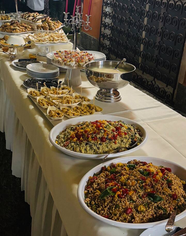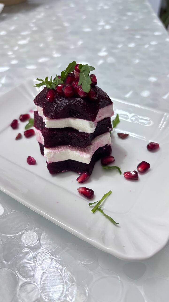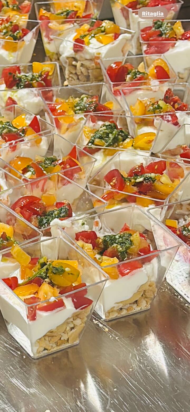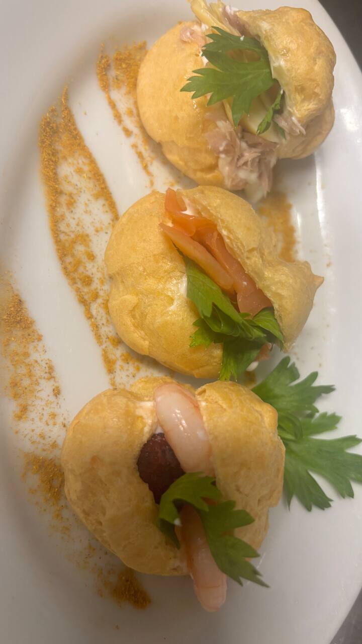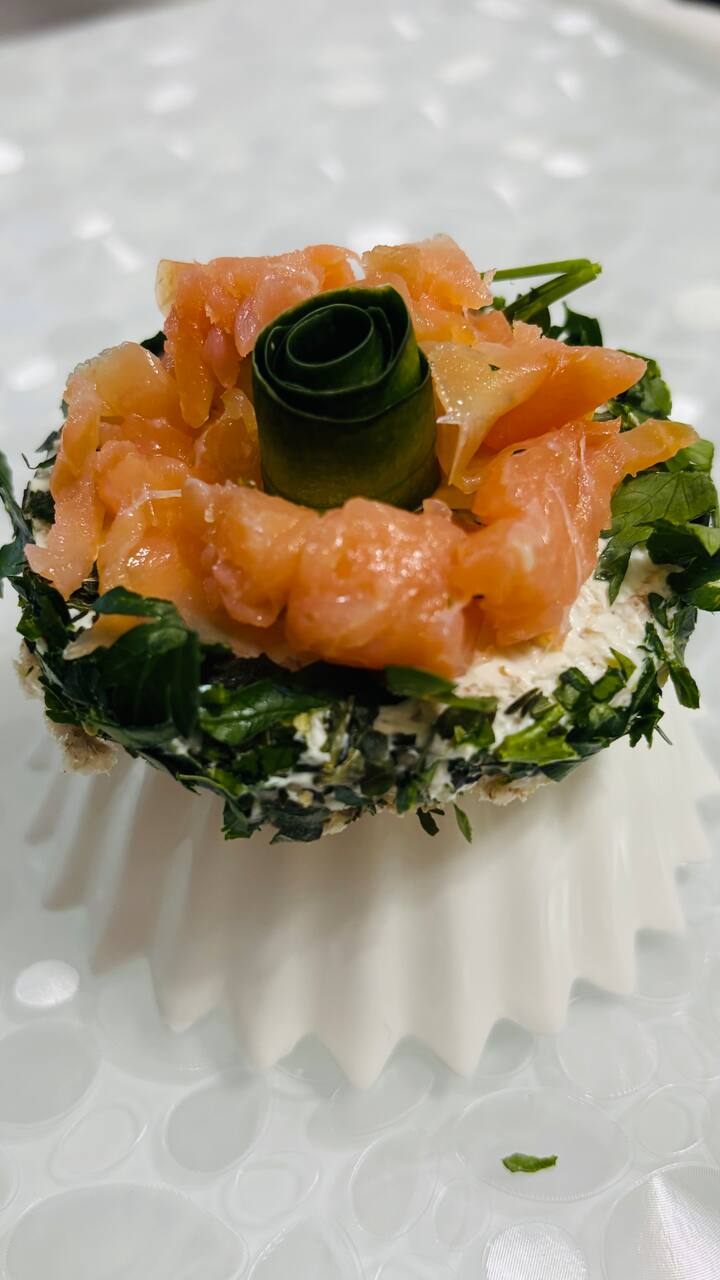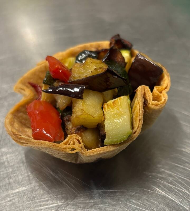 Comienza con un aperitivo de cestas de masa quebrada con caponata de verduras, albóndigas de berenjena, bresaola y albóndigas de queso brie con pistachos picados