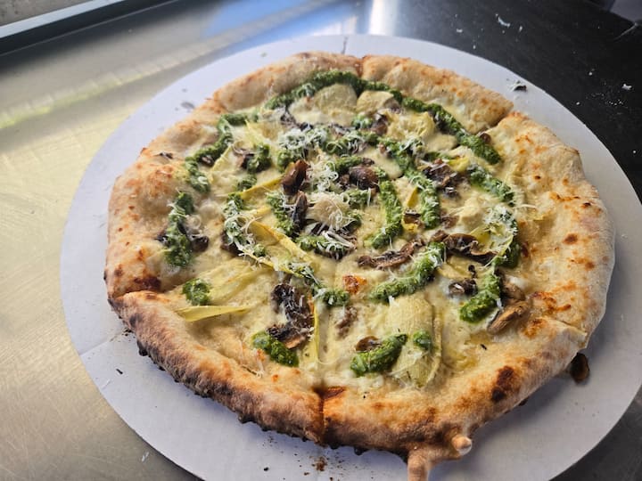 Esto incluye solo pizza. Hasta cuatro pizzas diferentes de tu elección. Todo lo que puedas comer por un asiento de 2 horas. Ofrecemos platos y utensilios necesarios para todos tus huéspedes. Todo está hecho fresco con harina orgánica. Nuestra masa se fermenta durante más de 48 horas para una mejor digestión.