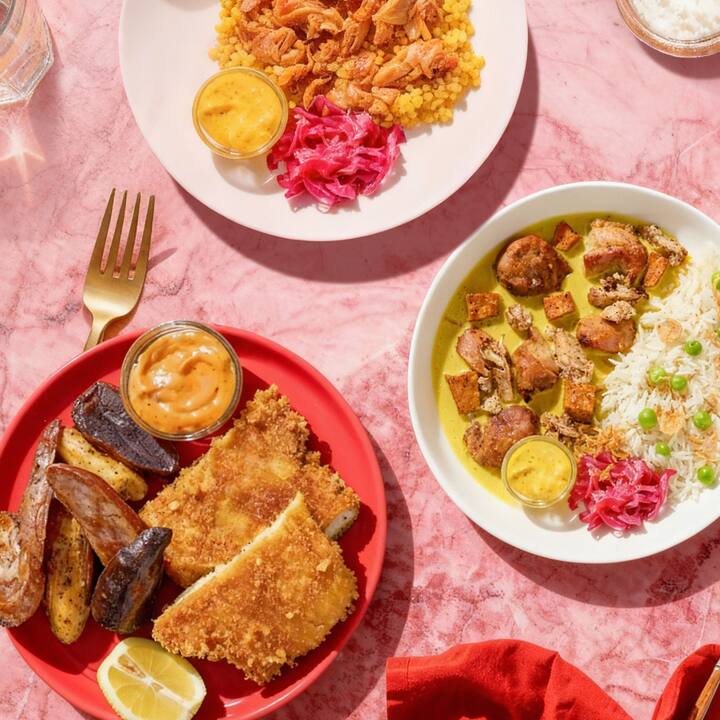 4 comidas. Combina dos de los platos más populares: pollo Shawarma de Oriente Medio (pollo especiado con shawarma y cuscús israelí con repollo dulce en escabeche y alioli amargo), pollo con patatas Za'atar (chuleta de pollo panko crujiente, patatas arco iris especiadas y una pizca de alioli harissa).