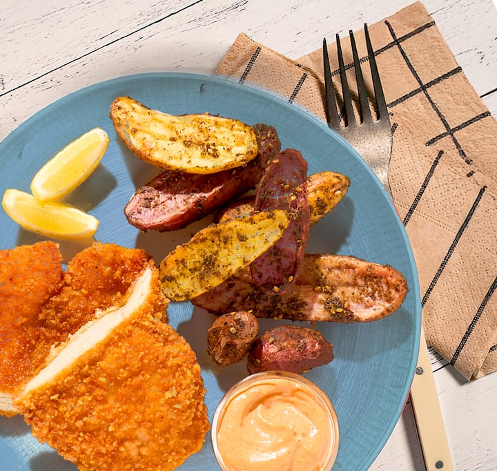 Disfruta del crujiente y satisfactorio corte de pollo panko crujiente, acompañado de papas fingerling arco iris especiadas y una pizca de alioli harissa. El equilibrio justo de calor, crujido y deliciosa indulgencia. Incluye 1 pollo con papas Za'atar por huésped.