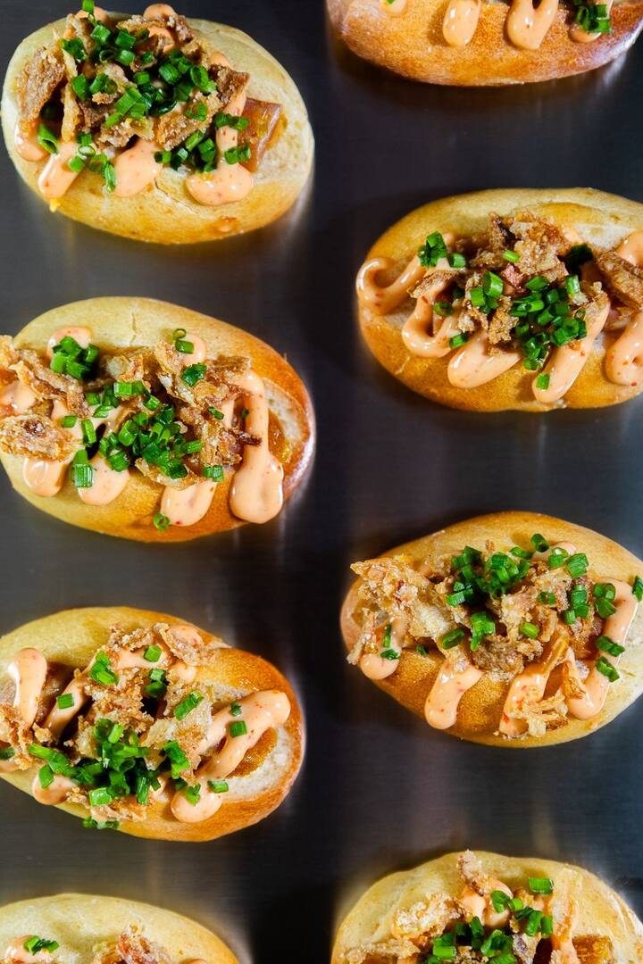 Preparo para cada comensal 8 bocadillos diferentes, es decir, 16 unidades por persona, para un cóctel con cena gourmet y personalizado.