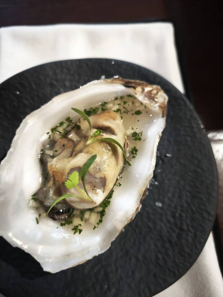 trabajo la ostra de forma natural, y con sus jugos y mango elaboró un ceviche en el cual luego de lo añado de nuevo a la ostra, es un bocado muy fresco, cítrico y ligeramente picante con todo el sabor a mar