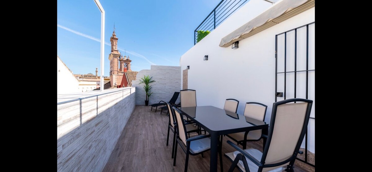 Con una ESPECTACULAR TERRAZA, estamos en el PLENO CENTRO de Sevilla. UN APARTAMENTO DE LUJO CON SERVICIOS MUY ESPECIALES A BAJO COSTE: traslados, masajes a domicilio, y servicio de lavado y plancha, TV 60p, con HBO, Netflix, Disney. POSIBILIDAD DE PARKING GRATUITO, PREGUNTE ANTES DE RESERVAR.. COMPLETO DESAYUNO (cafe expreso, zumo de naranja, pan, dulces, huevos, embutidos, fruta, etc) BAÑO CON VISTAS AL EXTERIOR y CINE DE VERANO en la terraza: ve en pantalla gigante, tu peli favorita.