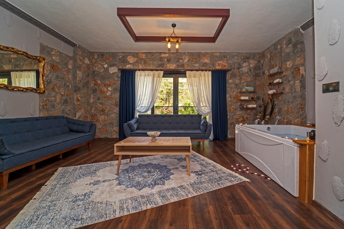 La villa vacacional armoniosa de piedra y madera especialmente diseñada cuenta con un valle único de mariposas, vistas al mar y la naturaleza. Una chimenea de la bañera de hidromasaje, que es adecuada para hacer senderismo en la histórica carretera Ikya, te espera para disfrutar de la puesta de sol, donde disfrutarás viendo la puesta de sol, que estará disponible para el huésped. Sauna de una hora, una tarifa adicional de 10 $ La piscina es salada, de uso gratuito Calefacción de la piscina Cargo adicional de 60 $ por día la piscina se puede encender con vidrio y la calefacción de los lados cerrados (27-29) grados 2 días antes de la aprobación se debe dar