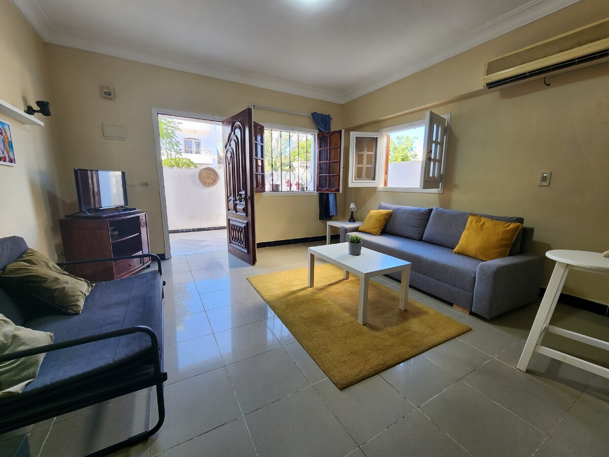 Acogedor apartamento de 1 dormitorio en el corazón de Hadaba, Sharm El Sheikh. Planta baja con 2 balcones, wifi de alta velocidad, aire acondicionado, TV, sofá cama, lavadora, cocina completa. Villa segura con aparcamiento. A pie de tiendas, restaurantes, gimnasio y transporte. Cerca de playas de arena y coral. Acceso a la azotea con hermosas puestas de sol. ¡No fumar en interiores! Ideal para parejas o viajeros solitarios que buscan sol y relajación.