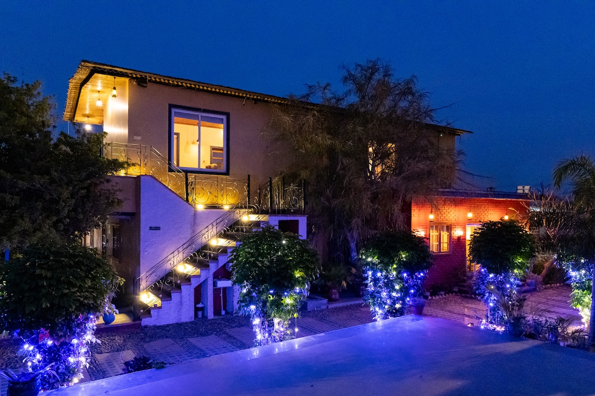 «The Golden Door» es una habitación diseñada artísticamente con baño adjunto en una terraza privada con vistas panorámicas a las colinas de Aravali. Ideal para parejas, viajeros individuales y profesionales de negocios, este alojamiento combina a la perfección estética y funcionalidad. Su ubicación céntrica ofrece un fácil acceso a las principales atracciones. En esencia, «The Golden Door» trasciende las estancias convencionales. Con su céntrica ubicación, diseño artístico y comodidad, ofrece una estancia sencilla pero única.