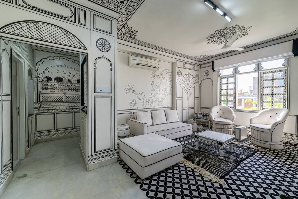 Descubre la realeza en Hidden Haveli, donde el diseño Mewari se une al lujo moderno en el corazón de Jaipur. 🏰 🏰Este dúplex muestra la herencia de Rajastán con intrincadas tallas de piedra arenisca, detalles pintados a mano y una terraza privada que ofrece vistas de pavos reales 🦚y aves. 🏰Cocina en la cocina de fusión, contempla las estrellas en el techo del cielo y duerme cómodamente en una cama doble de espuma viscoelástica. 🏰Sumérgete en la cultura de Rayastán mientras disfrutas de las comodidades contemporáneas de Haveli. Reserva ahora para una estancia real.🏰