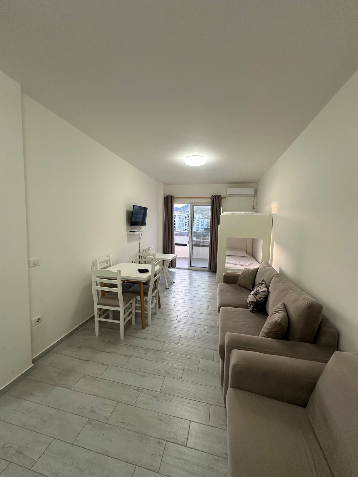 Un lujoso apartamento moderno frente a la playa, a estrenar, con impresionantes vistas panorámicas en la playa de Shengjini. Este elegante apartamento cuenta con 1 dormitorio con mala planta tamaño queen de espacio en el armario, 2 sofás cama, sala de estar, baño, cocina completa, comedor y un gran balcón. Wifi gratuito . Rodeado de todos los servicios a poca distancia a pie. Otros aspectos destacados incluyen: toallas de baño frescas, de mano y de playa. Lavadora Plancha, tabla de planchar y secador de pelo