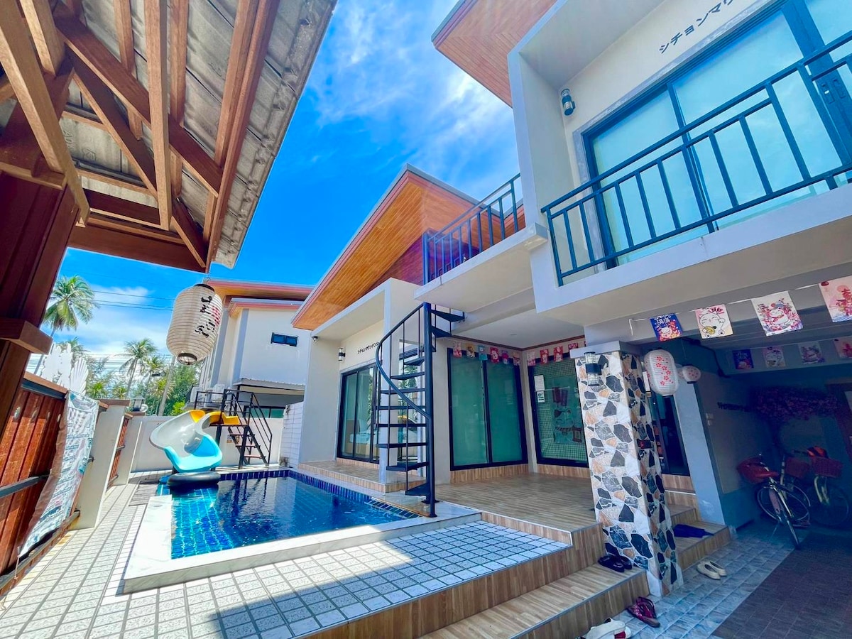ที่พักอบอุ่นเหมาะสำหรับครอบครัว ตกแต่งสไตล์ญี่ปุ่น สามารถพักได้ถึง 11ท่าน มีสระว่ายน้ำ อยู่ใกล้ทะเลแค่100เมตร สามารถเล่นน้ำทะเลได้ มีความปลอดภัยและเป็นส่วนตัว มีห้องคาราโอเกะเก็บเสียง ใช้เสียงได้ทั้งคืนไม่จำกัดเวลา อยู่ใกล้สถานที่ท่องเที่ยวและคาเฟ่หลายแห่ง อยู่ใกล้ตลาด