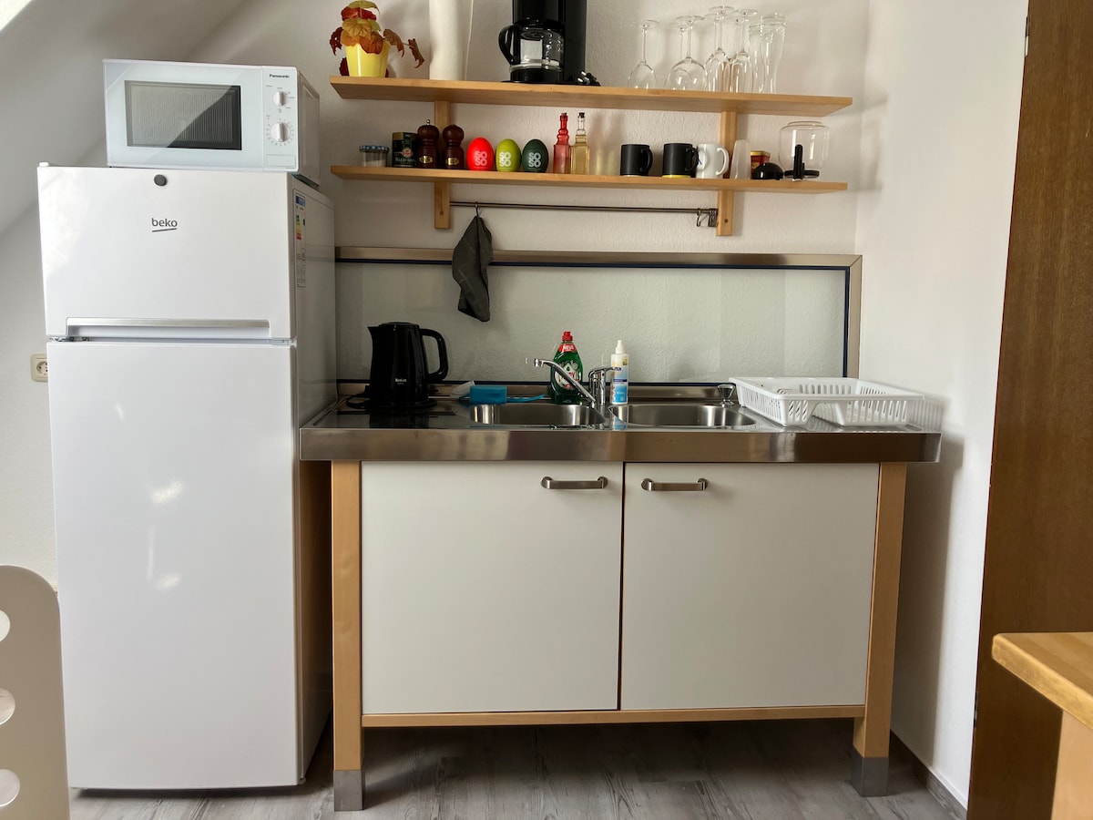 Komplett neu renovierte & möblierte 22Qm/ 1 Zimmer Wohnung. Es gibt einen eigenen Zugang, zur Souterrain-Wohnung. Die Deckenhöhe ist ca 195 cm. Dazu gibt es eine kleine Küche, mit Ceranfeld, ein Spülbecken und eine Kühl/Gefrierkombi. Die Küche ist voll ausgestattet. Eine separate Toilette mit Waschbecken und Fön gehört auch zur Wohnung, sowie eine Dusche.Ein Fernseher, Kommoden, Esstisch mit 2 Stühlen dazu. Ein großes Boxspringbett gehört auch zur Ausstattung. Wir wünschen euch schöne Ferien