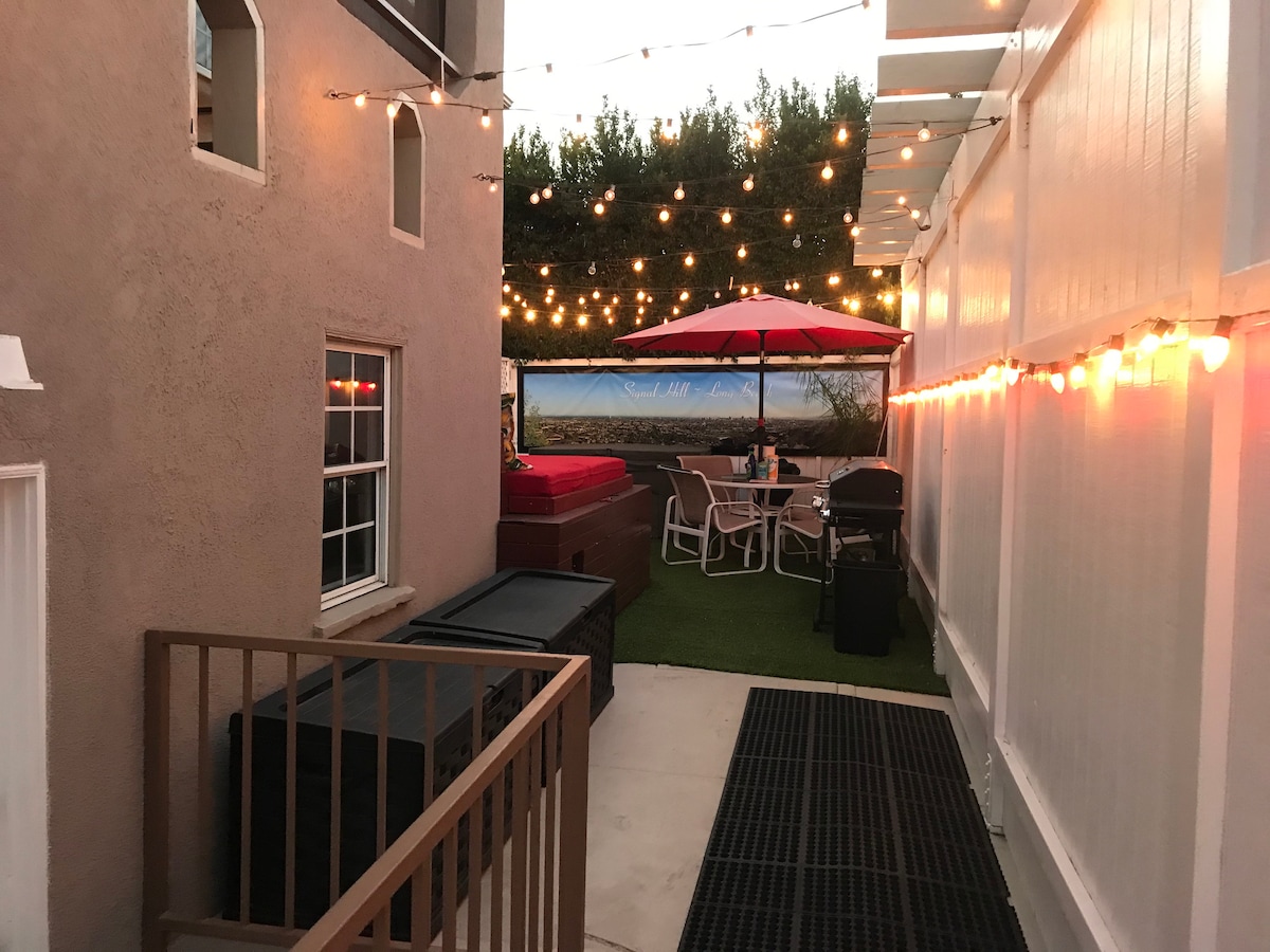 Elegante casa de huéspedes, a minutos de todo en Long Beach: Cal State Long Beach, Queen Mary, Pacific Coast Highway, playas, acuario, centro de convenciones, gran vida nocturna. Ubicación única en una manzana privada y aislada en Signal Hill. Disfruta de la ciudad y regresa a tu espacio para descansar y utilizar las comodidades del patio: jacuzzi, cama de día, barbacoa, TV Roku y 2 Fire Sticks en los dormitorios y cocina completa.